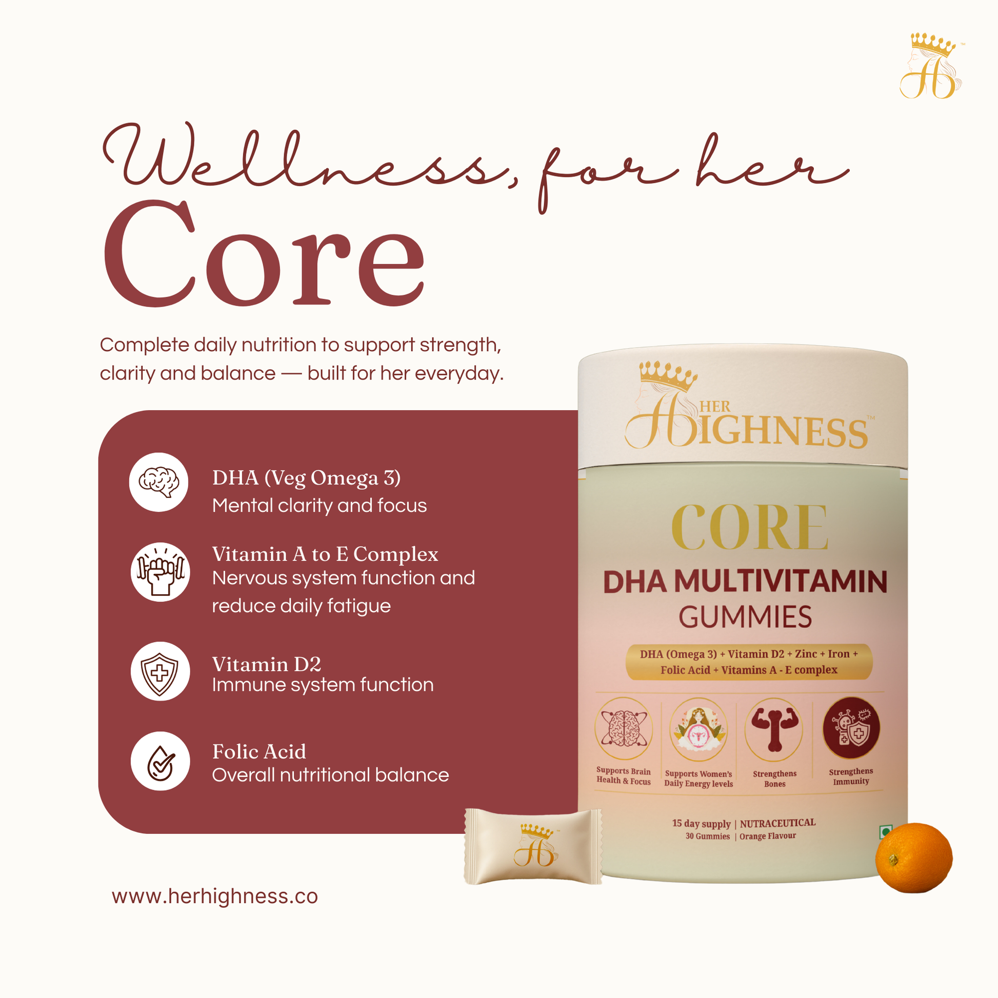 CORE is a daily multivitamin gummy designed to support essential nutritional gaps commonly seen in women. It combines DHA, key vitamins, and minerals to support brain health, energy levels, and overall vitality.