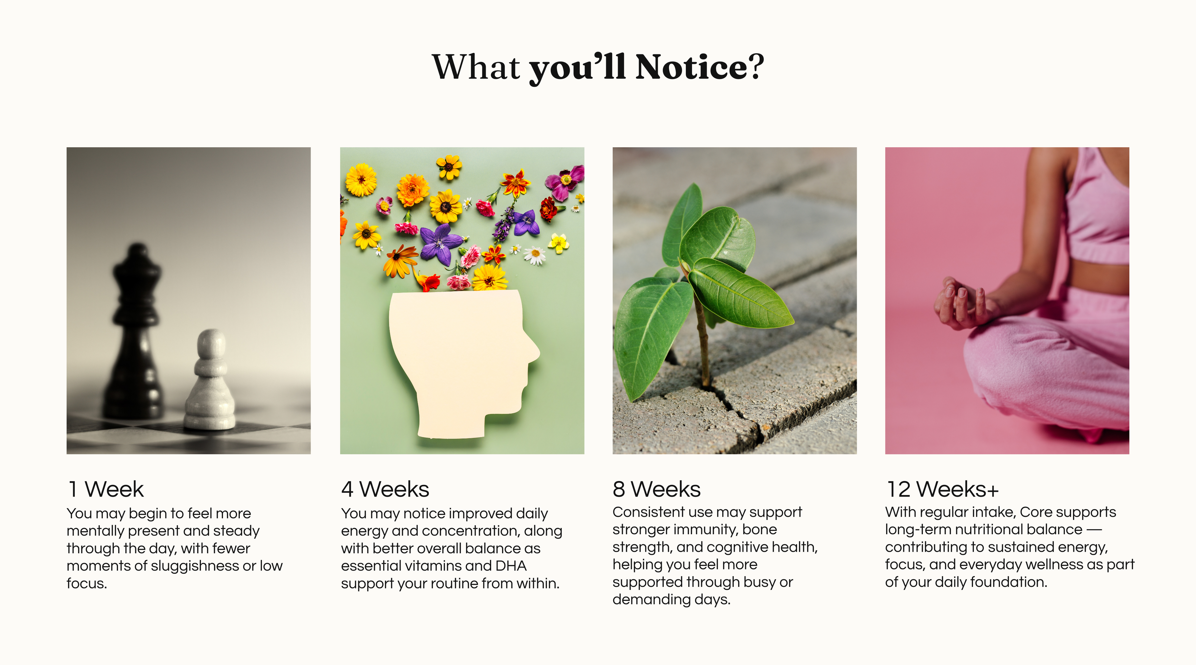 Rather than megadosing, CORE focuses on steady daily nourishment that fits naturally into your routine.